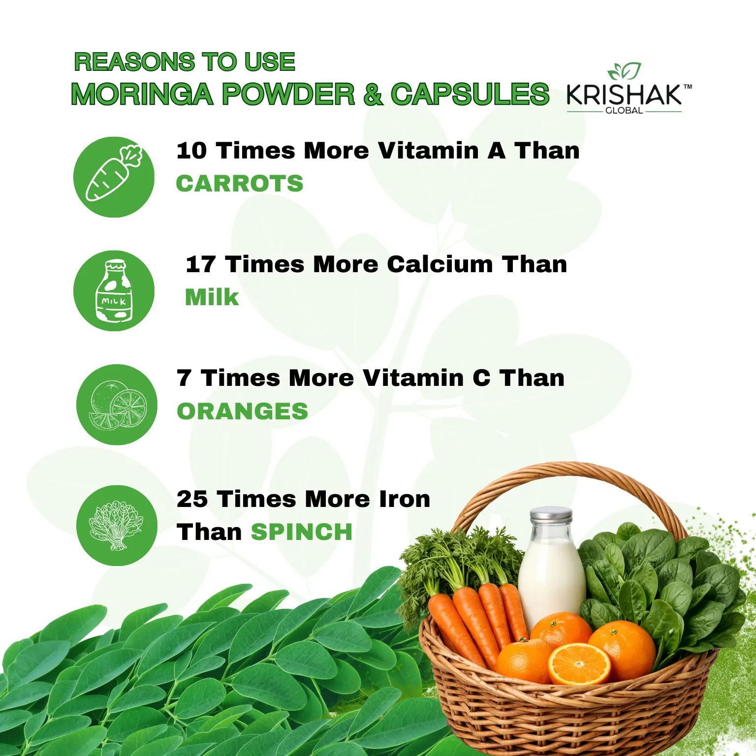 Both moringa powder and capsules help support immunity, energy levels, metabolism, digestion, and overall vitality when taken regularly. Rich in natural nutrients like calcium, iron, magnesium, and antioxidants, moringa supports balanced nutrition and daily strength as part of a healthy lifestyle.